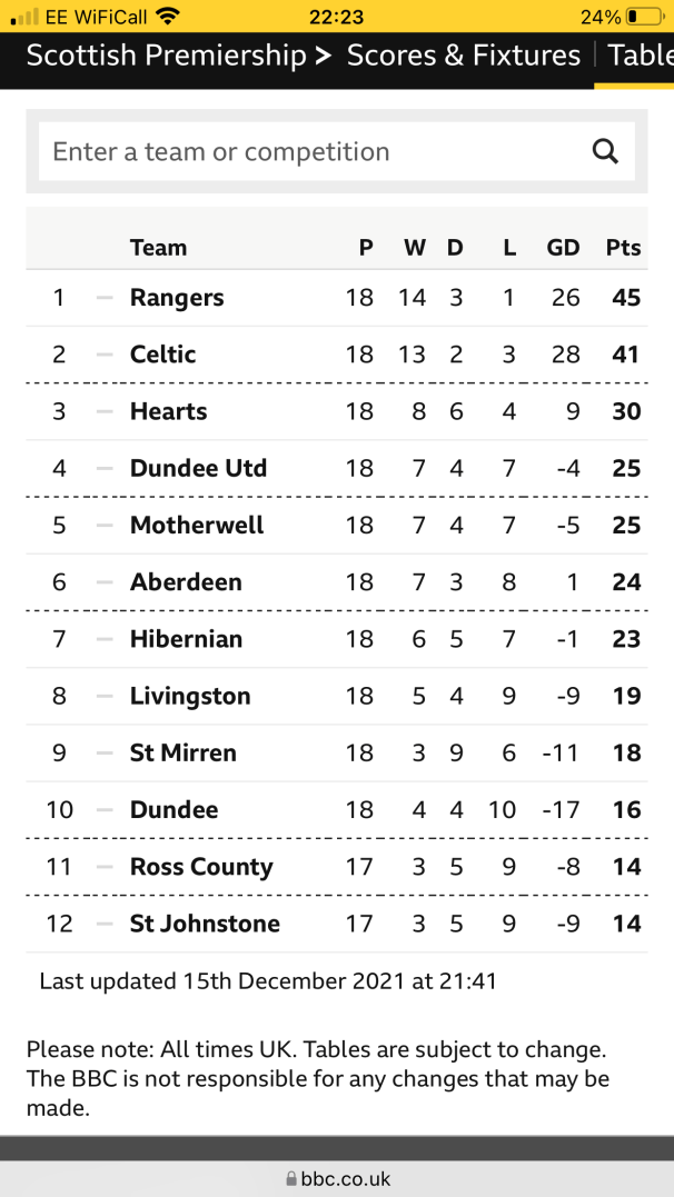 The Scottish Premiership table at 10PM on 15 December 2021. The Also Rans trail Rangers and Celtic to an embarrassing extent. For 37 seasons, these two clubs have monopolised the division, the least competitive in Europe!